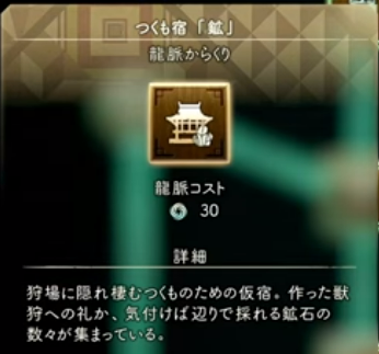 いち早く龍脈からくりのつくも宿(鉱)を開放することが鉱物類充実の秘訣です。獣狩りに向かわずとも、ログインしているだけで鉱物類を自動収集してくれるため、武器や装備作成時に鉱物で困ることがありません。