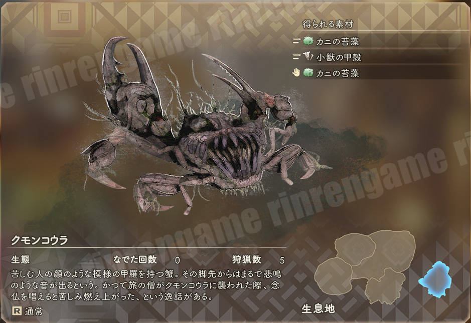 苦しむ人の顔のような模様の甲羅を持つ蟹。その脚下からはまるで悲鳴のような音が出るという。かつて旅の僧がクモンコウラに襲われた際、念仏を唱えると苦しみ燃え上がったという逸話がある